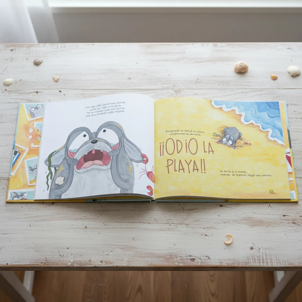 Un día, su dueña lo anima a salir a la playa. A regañadientes va, pero lo único que hace es rabiar, ensuciarse y quejarse.