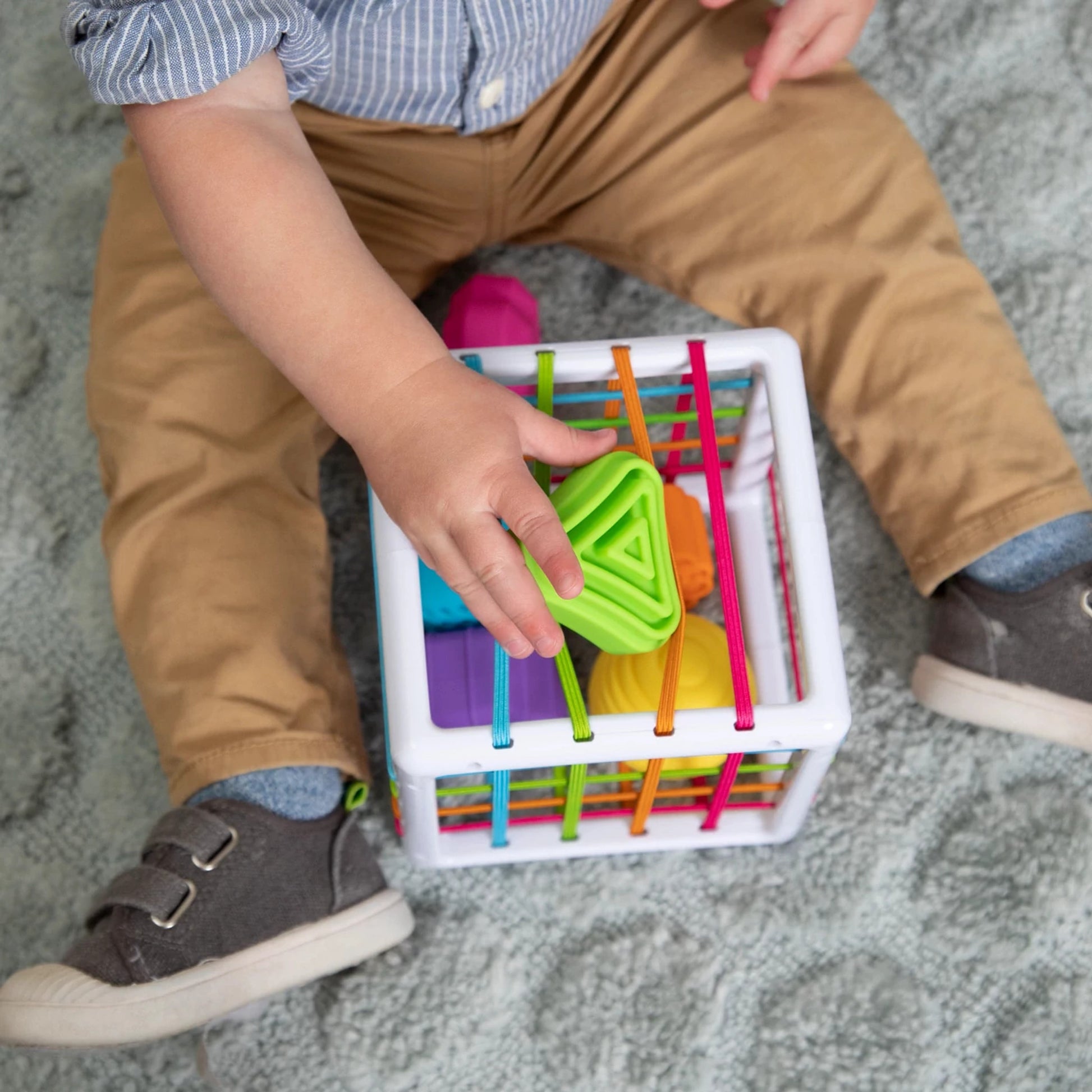 ¿Lo mejor de todo? Al presionar las formas a través de las bandas elásticas del cubo, los niños despiertan su curiosidad y no pueden evitar explorar, experimentar y descubrir. ¡Es maravillosamente simple y asombrosamente estimulante!