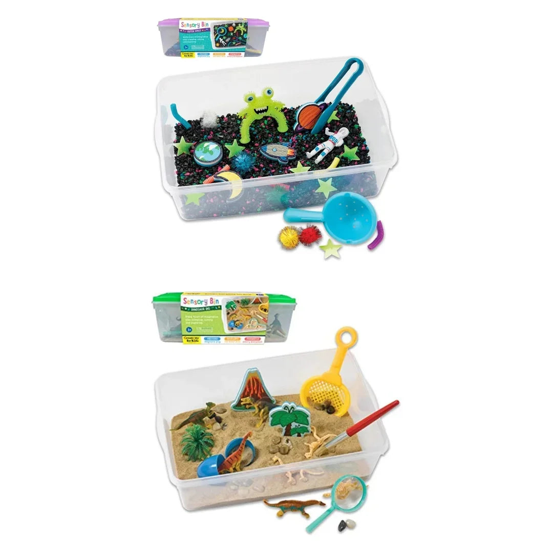 Sumérgete en mundos fascinantes y educativos con nuestro pack de Cajas Sensoriales. La Caja Sensorial Espacio Exterior te llevará en una misión intergaláctica con rocas espaciales, astronautas y alienígenas. Mientras que la Caja Sensorial Dinosaurios te transportará a la era prehistórica con arena de juego, dinosaurios y un volcán de juguete. Estimula habilidades cognitivas como el conteo y la creatividad, ideal para el desarrollo integral de los más pequeños a partir de 3 años (supervisado). ¡Explora, aprende y diviértete!