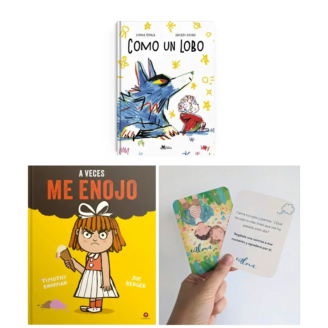 Un kit educativo imprescindible para ayudar a los niños a manejar sus emociones de manera saludable. Este pack incluye "Como un lobo", una entretenida historia que promueve la identificación y expresión de emociones, así como el diálogo entre padres e hijos. Además, "A veces me enojo" aborda el manejo del enojo de forma divertida y cercana. Complementando estos libros, las tarjetas de "Calma" ofrecen ejercicios de mindfulness para ayudar a los niños a encontrar la calma y regular sus emociones en momentos de ansiedad. Una oportunidad perfecta para promover el bienestar emocional de los más pequeños.