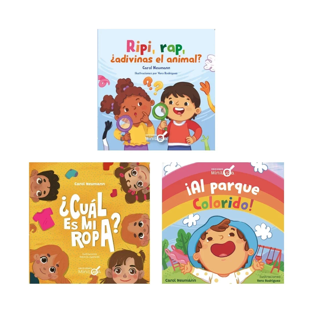 Descubre un mundo de vocabulario y diversión con este singular paquete que incluye tres libros educativos para niños de 0 a 3 años. Desde adivinanzas sobre animales en "Ripi, Rap, ¿adivinas el animal?" hasta aprender sobre prendas de vestir y opuestos en "¿Cuál es mi ropa?" y explorar los colores en "Al parque colorido", estos libros cartonés son perfectos para manos pequeñas. Escritos por Carol Neumann y con ilustraciones de Verónica Rodríguez y Rebecca Oyanedel, esta colección es una excelente herramienta para estimular el aprendizaje temprano de los más pequeños.