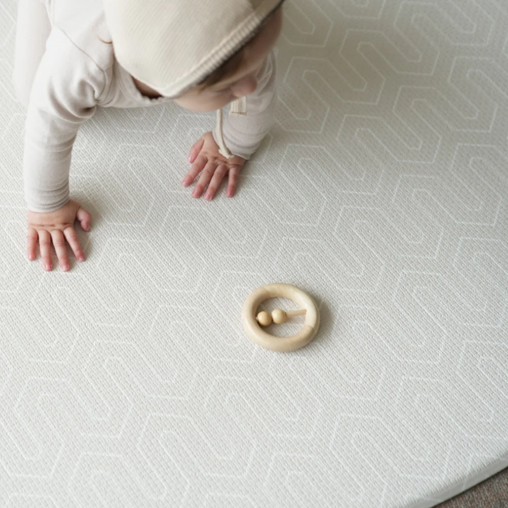 Lado B: Un patrón geométrico que tiene como fondo el color arena grisáceo y finas líneas en color blanco. Un Playmat versátil que se adapta a cualquier espacio.