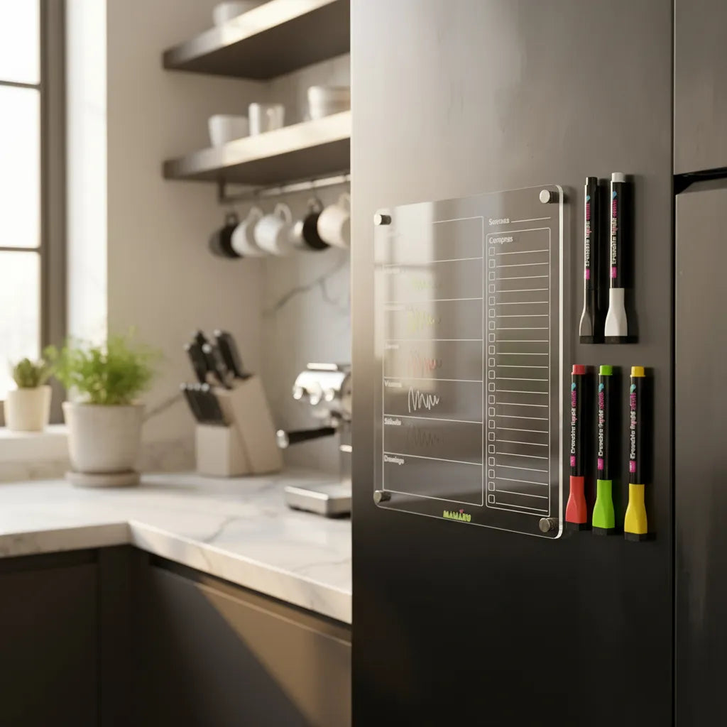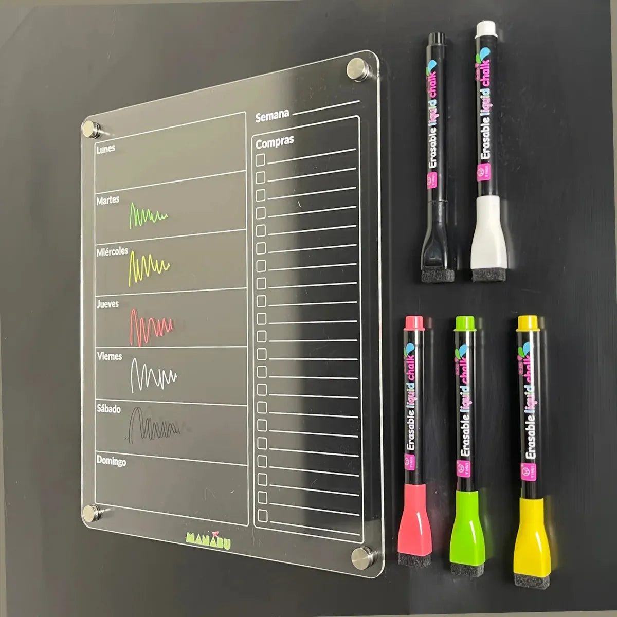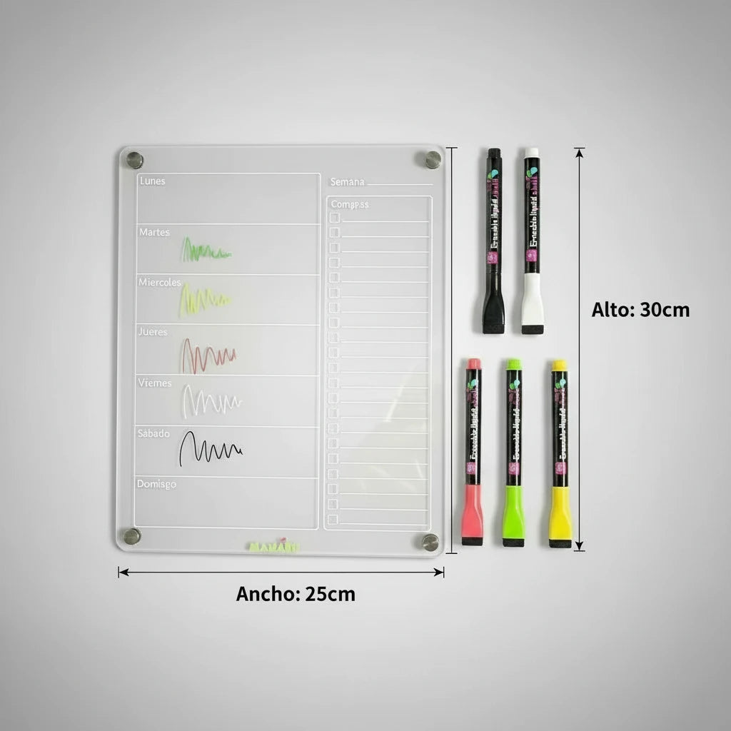 - Pizarra acrílica magnética reutilizable 25 x 30 cm: escribe, borra y vuelve a usar.