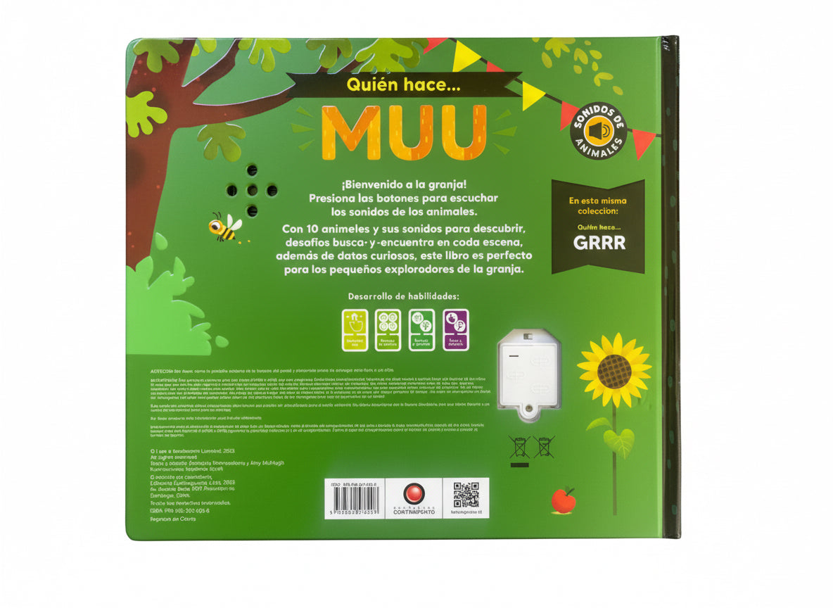 Una propuesta sonora y táctil para los primeros lectores, diseñada para estimular la curiosidad y el lenguaje desde los primeros meses. El libro Quién hace… MUU. Con 10 sonidos ofrece diez botones con efectos auténticos, ilustraciones expresivas y páginas de cartón resistentes, pensadas para manos pequeñas y uso repetido. La combinación de imagen y sonido facilita la asociación entre animal y ruido, refuerza el reconocimiento auditivo y favorece el desarrollo de la atención y la destreza motora fina.