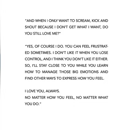 He asks her if she loves him always, no matter what he does or says—like when he’s angry because he loses a game, or when he feels shy around strangers and doesn’t want to leave her side.